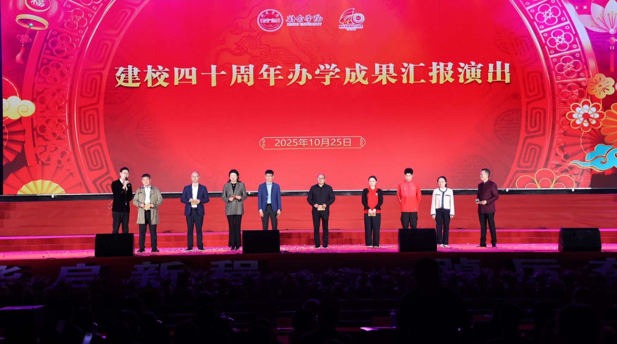 金秋的新余学院,丹桂馥郁,旌旗漫卷,处处涌动着欢庆的热潮。校门前,烫金的楹联与大红灯笼相映成辉;梦想广场四周的阶梯上,校训箴言与鎏金岁月字样错落排布。微风轻拂,绿草如茵,空气中浮动着思念与欢欣。10月25日,新余学院喜迎八方宾朋,建校四十周年庆典盛大开启。
